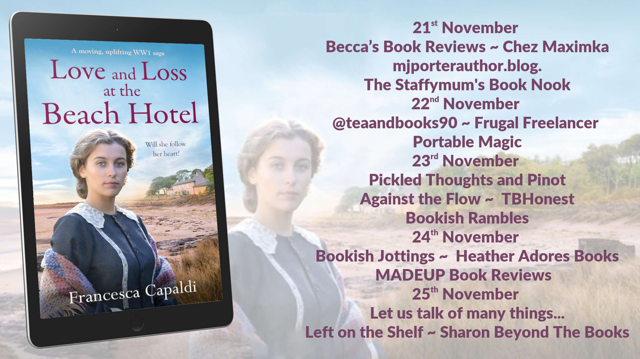Hetty Affleck is working as a maid at the prestigious Beach Hotel in Littlehampton. Her beau, Lorcan, is away at war and has recently stopped replying to her letters but she is determined to keep her spirits up. When she meets wealthy shipbuilder’s son Victor Perryman, they pass the time of day and they both feel a connection but she can’t allow herself to think anything more of it – not only does she have Lorcan to think of, but she and Victor are divided by wealth and class.