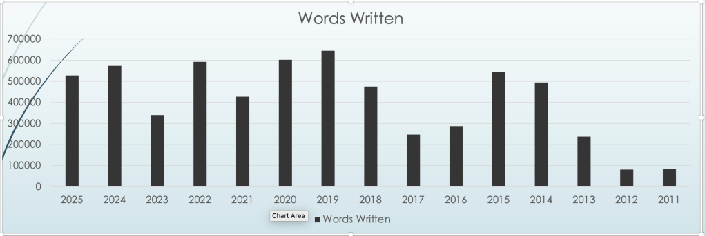 In terms of words written this year, it comes in at about 520k. Considering the three ‘missing’ months where I’ve hardly written anything, I’m pleased with that.